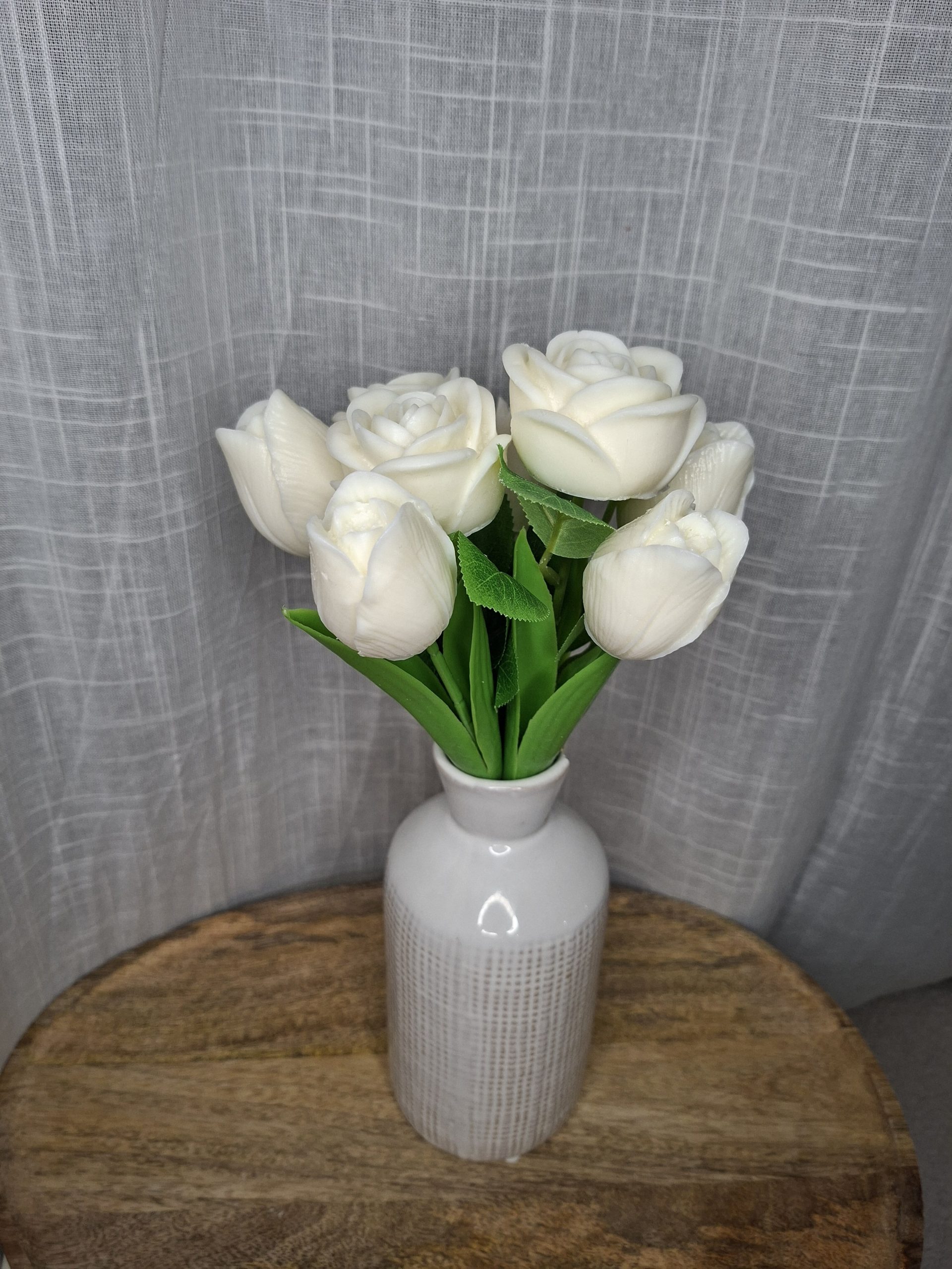 Découvrez l’élégance d’un bouquet qui ne fane jamais. Ce bouquet artisanal se compose de délicats fondants en forme de roses et de tulipes, façonnés à la main sur la Côte d’Azur en cire de soja 100 % végétale. Un objet décoratif poétique et raffiné qui embaume votre intérieur avant même d’être déposé dans votre brûle-parfum.
